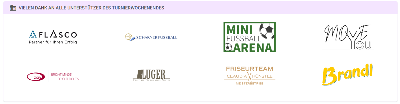 Ein besonderer Dank gilt allen Partnern, die die Durchführung der beiden Turniertage unterstützt haben: FLASCO – Partner für Ihren Erfolg | SCHARNER FUSSBALL | MINI FUSSBALL ARENA | MOVEYOU | ZKW BRIGHT MINDS – BRIGHT LIGHTS | LUGER | CLAUDIA KÜNSTLE FRISEURTEAM | BRANDL