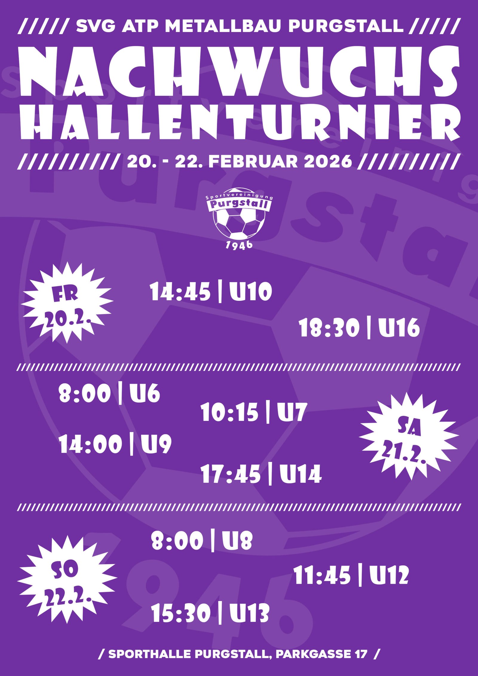 Die SVg Purgstall lädt auch im Jahr 2026 wieder herzlich zum traditionellen Nachwuchs-Hallenturnier in die Sporthalle Purgstall ein!